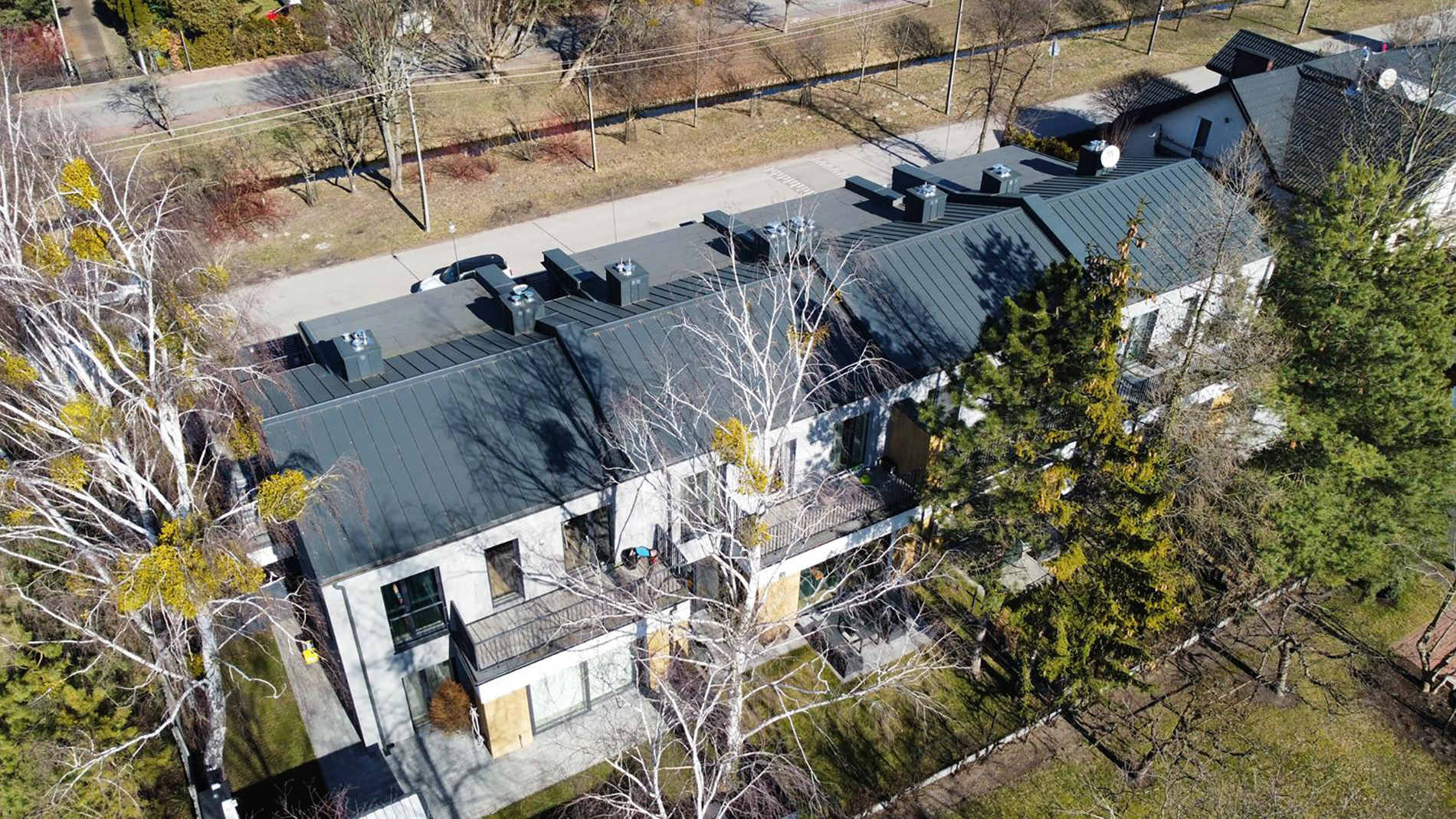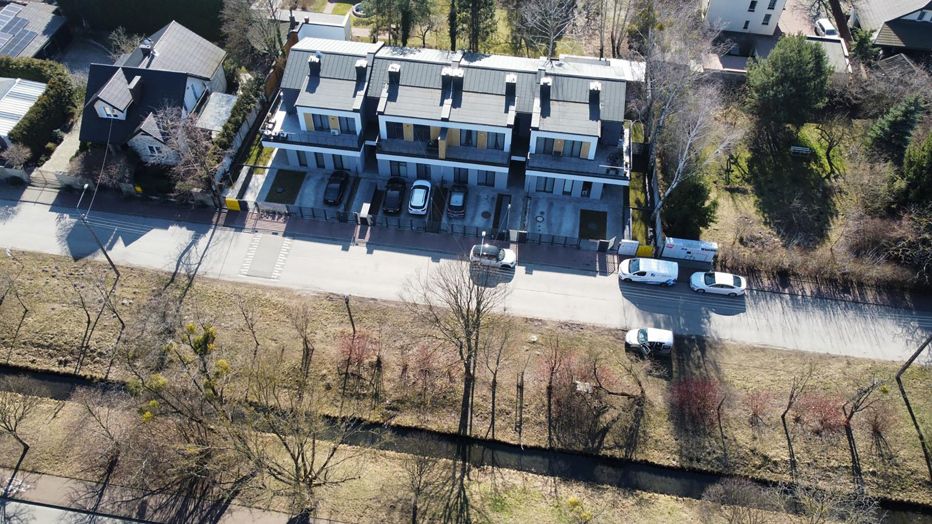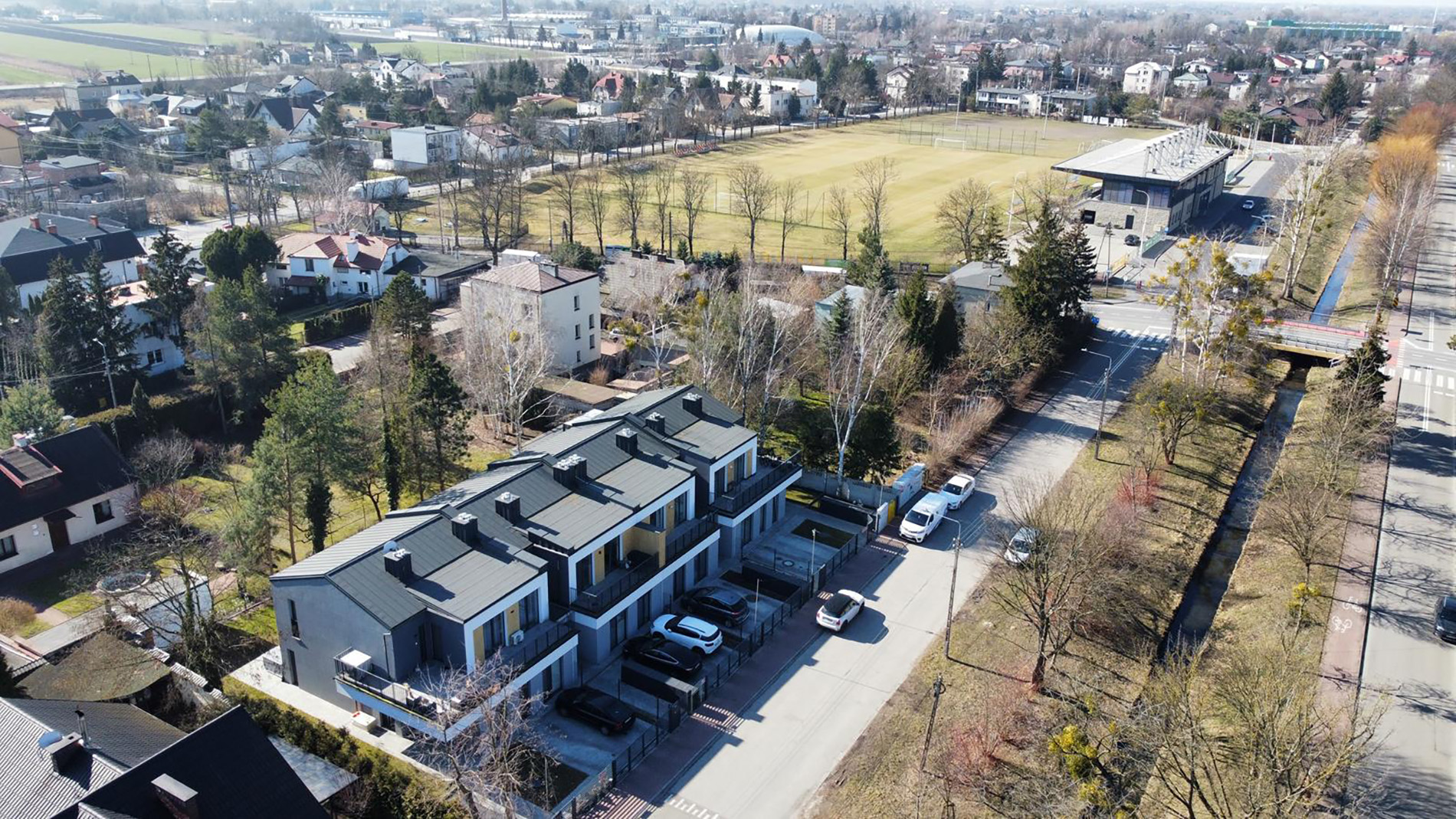Legionów 5 w Błoniu to zrealizowana inwestycja zaledwie 30 kilometrów od Warszawy, składająca się z czterech budynków jednorodzinnych dwulokalowych w zabudowie szeregowej. Projekt wyróżniają ciepłe, słoneczne elewacje, duże przeszklenia oraz przestronne tarasy, które stały się jednym z charakterystycznych elementów tej kameralnej zabudowy.
